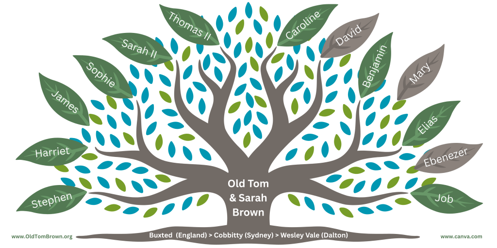 According to the “Old Tom Brown of Wesley Vale” booklet (published for the 1938 centenary celebrations), Old Tom & Sarah Brown have a massive family tree, comprising of: